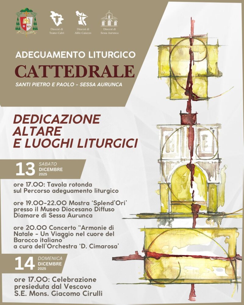 La Diocesi di Sessa Aurunca si prepara a vivere due giornate di grazia e di grande significato ecclesiale e culturale nella sua Chiesa madre, la Basilica Cattedrale Santi Pietro e Paolo. Con la consacrazione dei nuovi luoghi liturgici, giunge a compimento il cammino avviato nel 2018 con il Concorso Nazionale della Conferenza Episcopale Italiana per l’Adeguamento Liturgico delle Cattedrali, che ha visto la Cattedrale di … Continua a leggere Solenne Dedicazione del nuovo Altare e spazi liturgici della Cattedrale Santi Pietro e Paolo